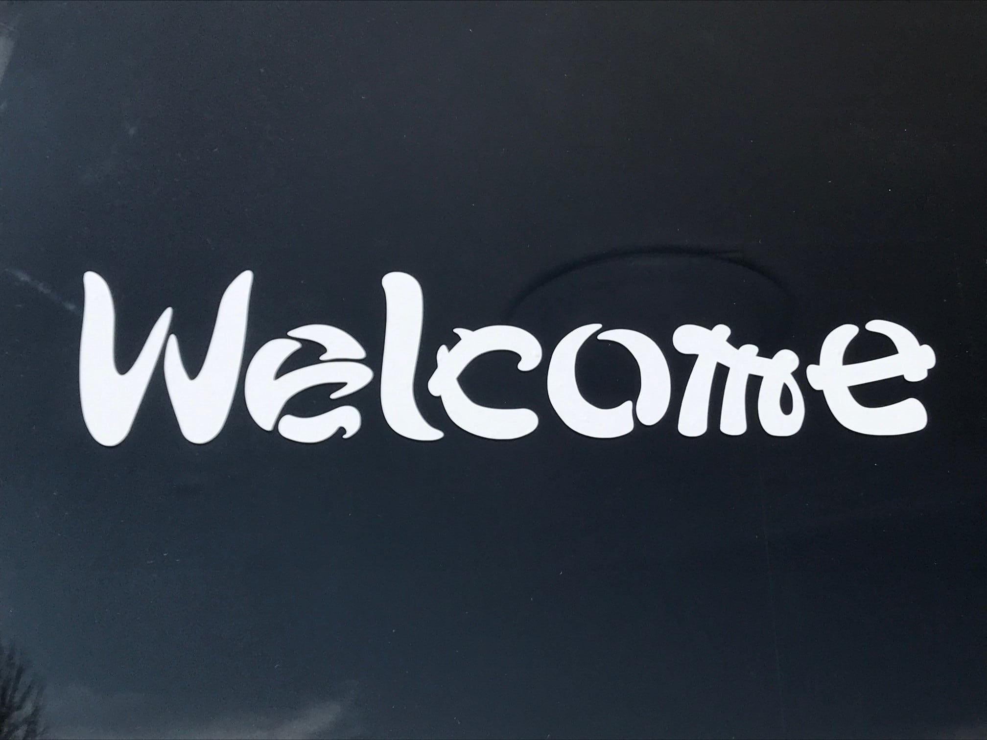英語「Welcome」にも日本語「いらっしゃいませ」にも読めるアンビグラム作品のステッカーです。